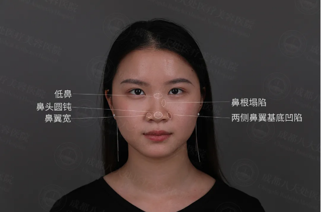 术前诊断 :低鼻、鼻根塌陷、鼻头圆钝、鼻翼宽、两侧鼻翼基底凹陷,整体中面部扁平,没有立体感。