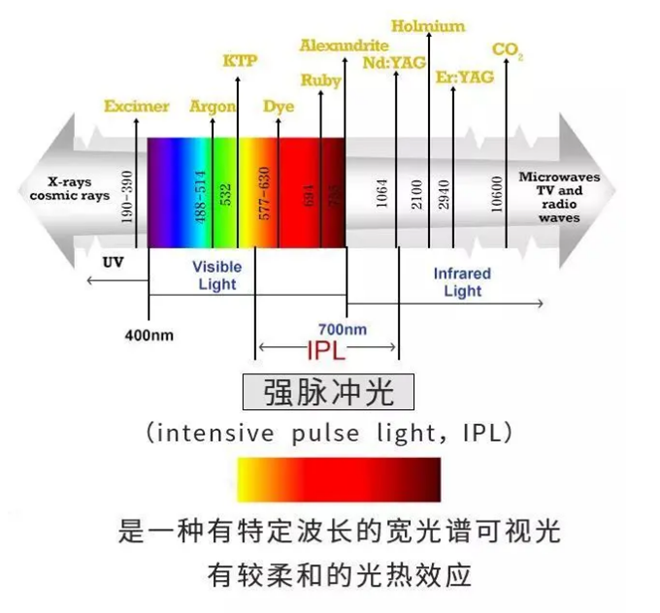 光子其实我们又叫强脉冲光(如图所示),它是一个宽光谱,通过这样一个宽光谱的光,打在我们皮肤的上面会产生作用,这些作用会让我们皮肤变好。