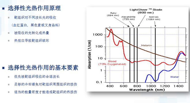 光子作用于皮肤,主要是通过3个靶基起作用。一个是我们表皮里的色素,另一个是真皮里的血管,还有真皮里的胶原。(如图3所示,IPL的作用原理—选择性光热原理)通过对这3个靶基作用,让皮肤产生变化,祛掉多余的色素、多余的血管,让胶原新生,皮肤莹润光泽。