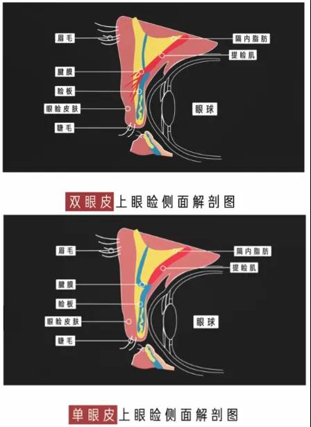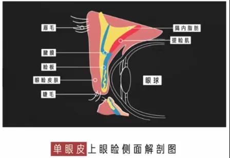 而单眼皮的形成是由于隔内脂肪的下界过低,下垂到睑板上缘前面,阻挡了提睑肌腱膜向外延伸,也就无法牵动皮肤形成褶皱。