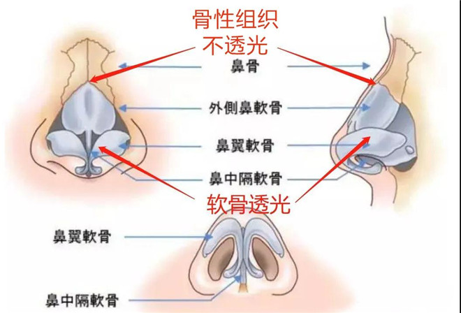 简言之,一个正常的鼻头,山根和鼻骨不会透光,鼻软骨会透光。
