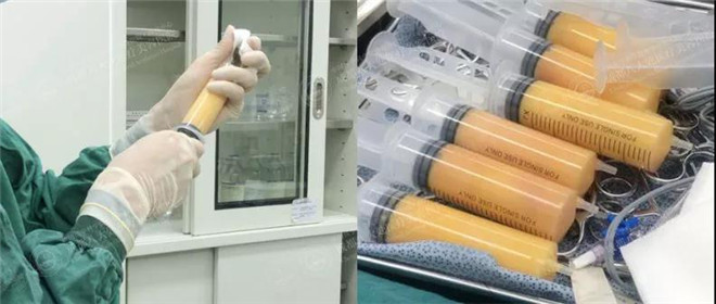 再看看我院唐院抽出的是纯黄色的,(颜色跟芒果差不多,非常漂亮)说明抽脂的创面小,流血少,术后恢复也会更快。
