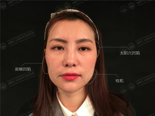 吴冬梅医生:这位求美者最为明显的面部问题就是衰老引起的中面部松弛下垂问题,主要表现在脂肪的逐渐萎缩,导致颧部脂肪垫逐渐往中下方下垂,导致法令纹明显;同时面颊部和颞部凹陷明显,导致整个面部轮廓线不流畅;该求美者还伴有咬肌肥大的问题。