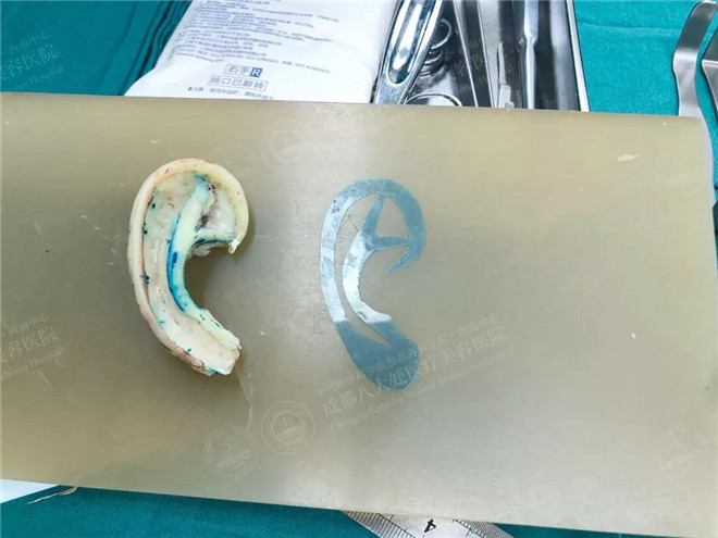 小耳再造手术时,我们会先根据患者健侧耳朵的大小及弧度做胶片模型,术中根据该模型从胸廓先采取第7肋(第7肋骨最为宽大),再采取第8肋做耳轮(第8肋细软且有弹性),最后视情况再采取第6肋(采取以细长为原则)。