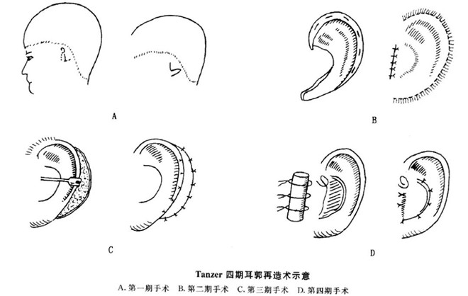 美国医生Tanzer应用块状雕刻自体肋软骨来制备耳支架,通过自己不断改进最终发展为稳定的四期法;后来,其学生Brent教授在他的基础上将其改良为三期法。