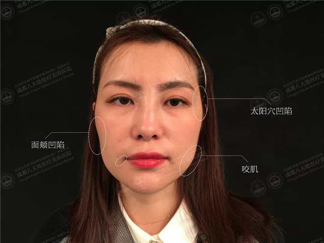 吴冬梅医生 :这位求美者最为明显的面部问题就是衰老引起的中面部松弛下垂问题,主要表现在脂肪的逐渐萎缩,导致颧部脂肪垫逐渐往中下方下垂,导致法令纹明显;同时面颊部和颞部凹陷明显,导致整个面部轮廓线不流畅;该求美者还伴有咬肌肥大的问题。