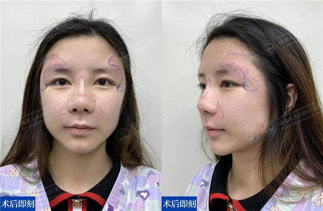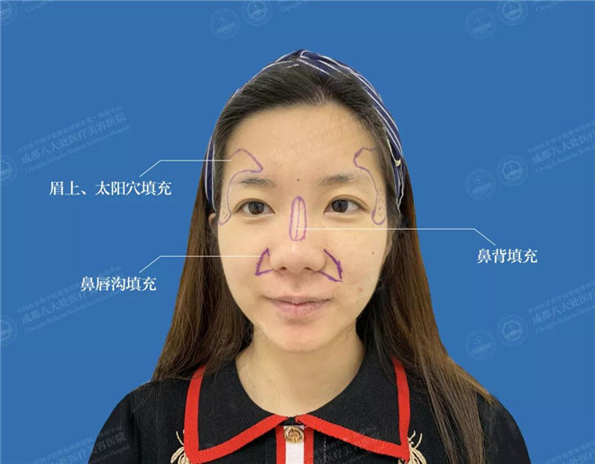 眉上、太阳穴填充可以解决面部轮廓的问题;鼻背填充解决侧面立体感问题;鼻唇沟填充增加鼻基底高度,减轻法令纹,从而达到减龄的效果。