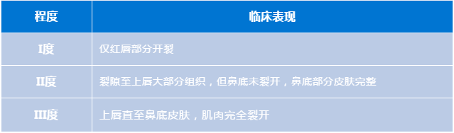 首先是唇裂,唇裂按照裂隙的程度分为I度、II度、III度: