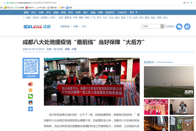 除了捐赠物资和支援一线外,成都八大处还充分发挥自身资源优势,2月11日开启线上面诊,全体专家上阵;2月20日开启整形科普漂亮战疫公益直播,连续每周多期深度科普疫情期间常见皮肤维养问题惠及公众,帮助公众更好地对抗疫情。