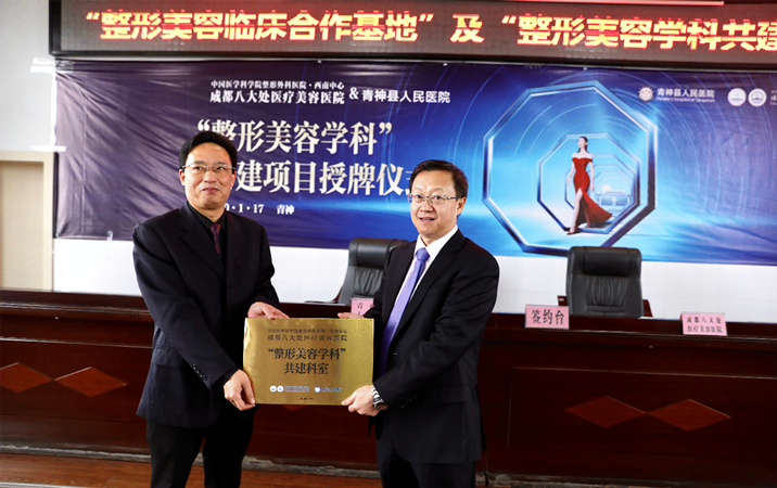 2019年医美行业乱象频发,为推进整形外科行业稳步规范发展,助力西南地区整形医疗水平的提升,成都八大处医疗美容医院(以下简称:成都八大处)作为中国整形领域行业奠基人,既拥有先进技术及医师资源,又有解决医疗供需关系平衡发展的使命。从医疗本质出发,着眼于实际,以学科共建的方式,将专技服务下沉,1月17日,成都八大处与青神医院集团青神县人民医院整形美容学科共建授牌仪式在青神县人民医院举行。