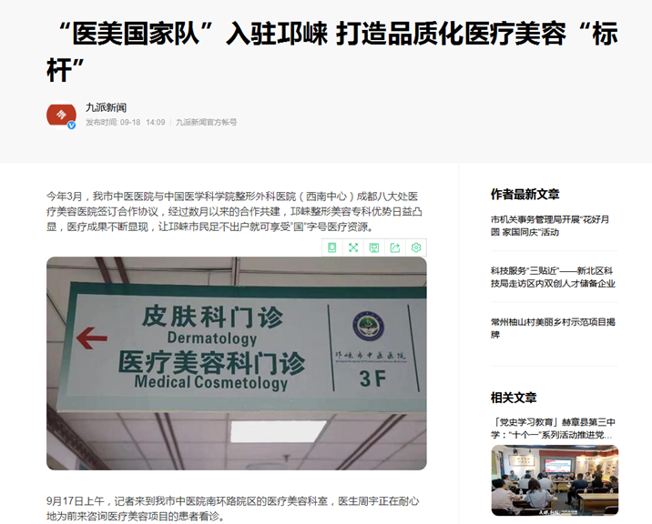 中国医学科学院整形外科医院整形科主治医师周宇:“中国医学科学院整形外科医院是国家唯一的一个三甲级别的整形外科医院,合作共建以来,我们帮助邛崃市中医医院组建了整形科,积极培养年轻医生,帮助他们快速提升医美方面的技能,更好的服务于大众。”