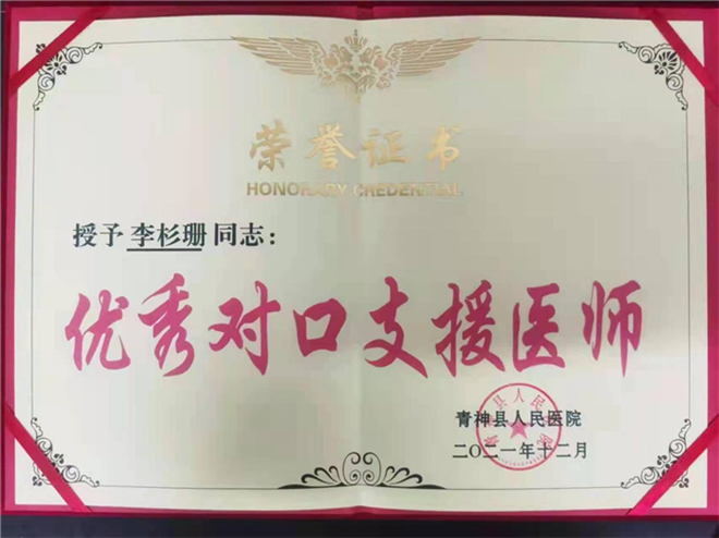 (李杉珊医生被青神县人民医院授予“优秀对口支援医师”荣誉称号)