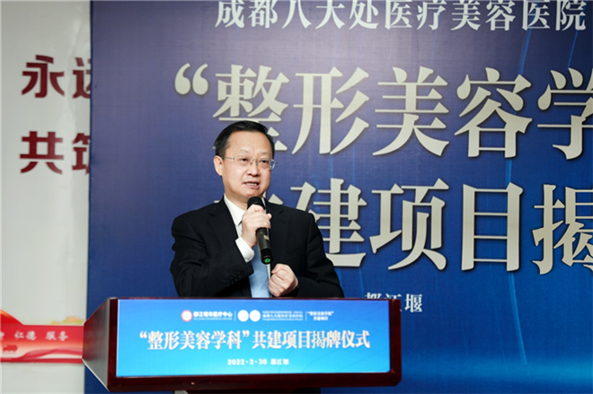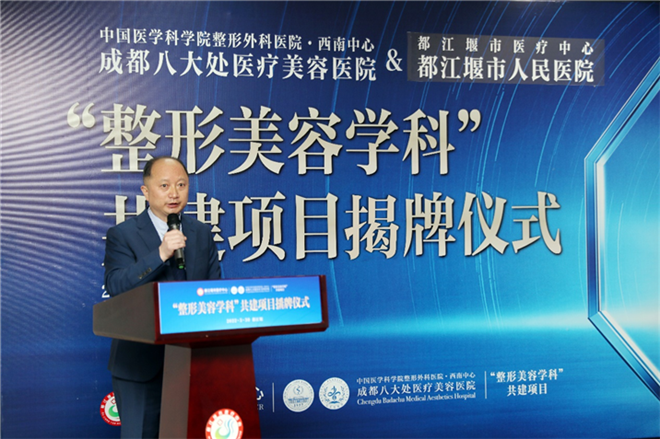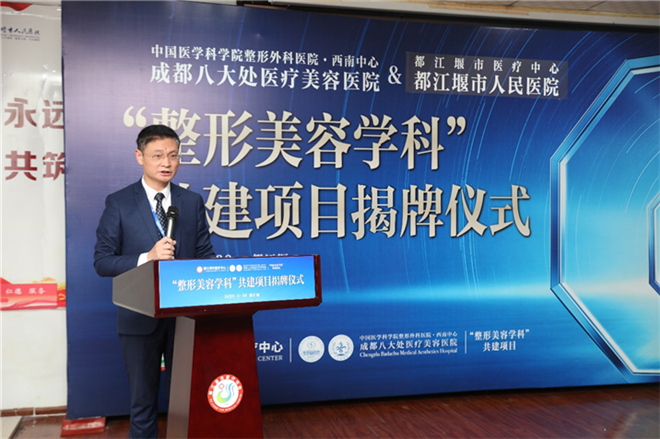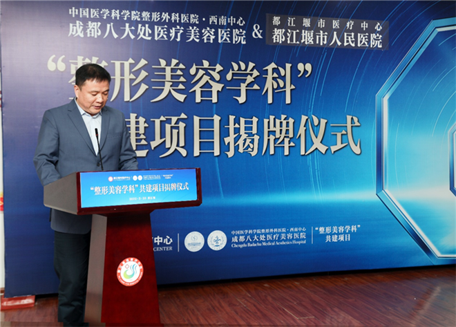 都江堰市卫生健康局党组书记、局长罗斌在签约揭牌仪式上代表都江堰市卫生健康局向两家医院达成合作表示祝贺。罗斌表示:“成都打造‘医美之都’,将医疗美容产业作为战略新兴产业加以系统谋划和纵深推进,全市医疗美容产业持续蓬勃发展、优化升级。都江堰市的医疗美容,特别是美容外科尚处于起步阶段,需要得到业内权威力量的支持。成都八大处是‘国字号’整形美容医院,拥有我国顶尖的整形美容技术及资源。此次成都八大处与都江堰市人民医院携手共建,将弥补都江堰市医疗美容事业发展不足,促进全市医疗卫生事业竞争力和影响力提升。”