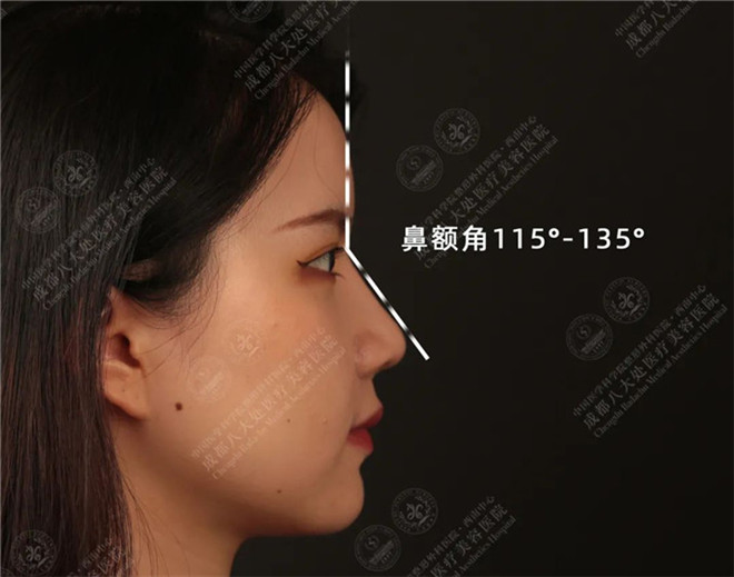 第二是鼻额角,它是指鼻梁与额头之间的夹角,这个夹角会一定程度上影响鼻子的高度。我们鼻子的高度并不是越高越好,它也有个理想的角度范围,通常认为它在115°-135°为宜。