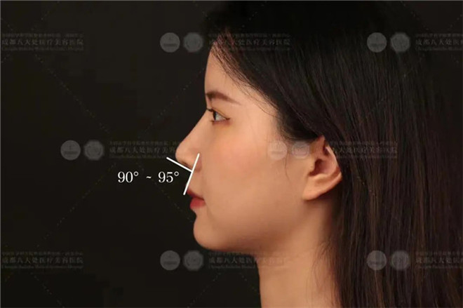 第三是鼻尖角,它指的鼻背线与鼻小柱线的夹角,在美学标准中,我们一般认为85°~90°就是最理想的角度了。