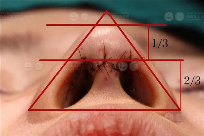 即从基底面看,鼻基底不能过宽,且略呈三角形,鼻尖下小叶不要过大,鼻孔形状似水滴状。而仰视正常的鼻尖形态,鼻顶部角度为60度,形态近似等边三角形。