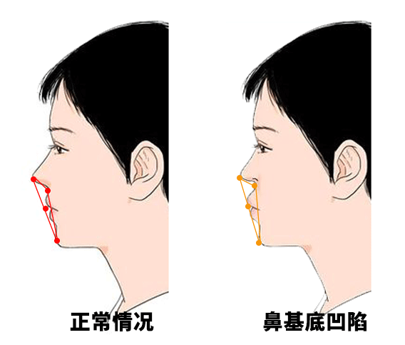 通过上面图片可以看到,当鼻基底抬高后,鼻尖-鼻翼基底连线与鼻翼基底-下颏间的连线形成的角度明显变大。