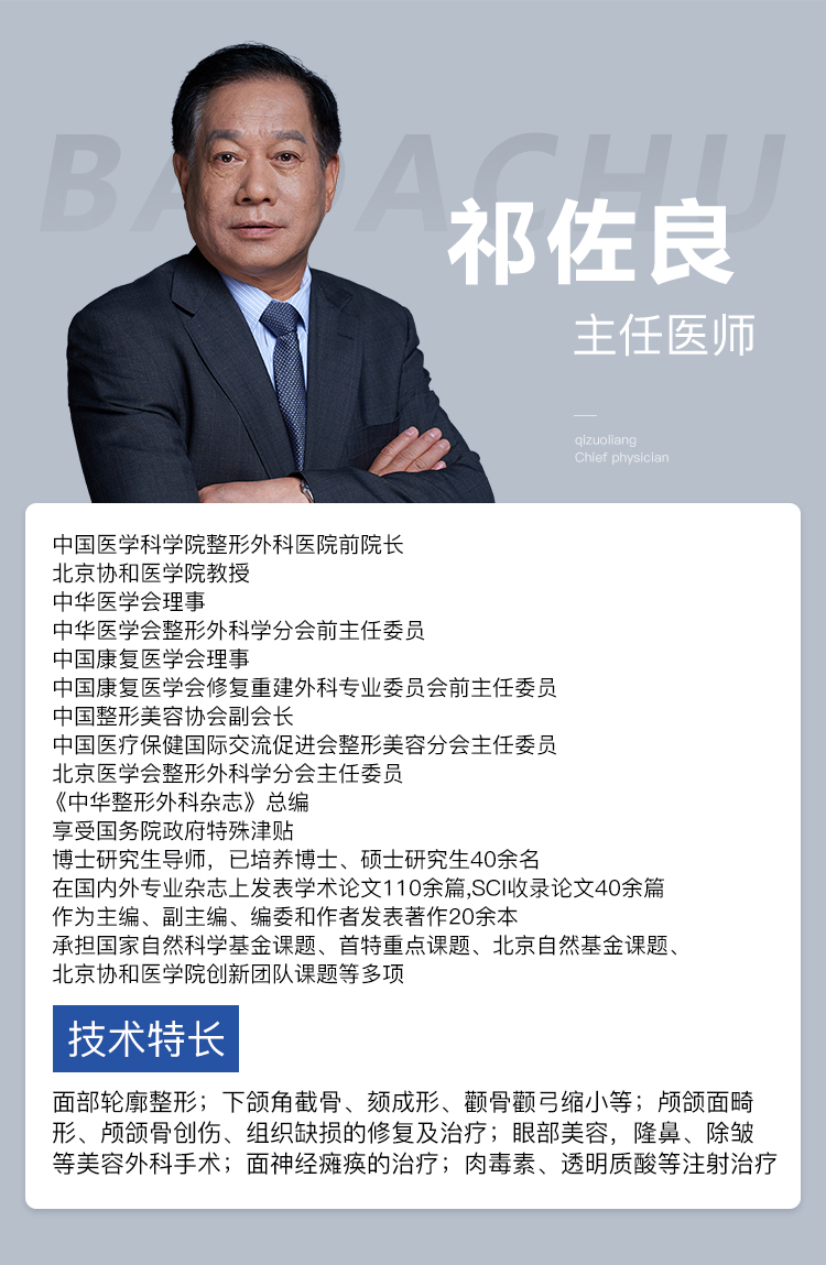 祁佐良是在国内外享有较大学术影响力的整复外科领域的专家,主要从事颅面畸形的治疗及各种美容外科手术,有口腔颌面外科和整形外科临床工作经历,积累了两个交叉学科的经验,并能应用显微外科技术于器官再造和组织缺损,手术风格追求精益求精,尤其在晚期面神经瘫痪的治疗、颅颌面畸形及创伤的修复等方面具有独到的效果和丰富的经验。
