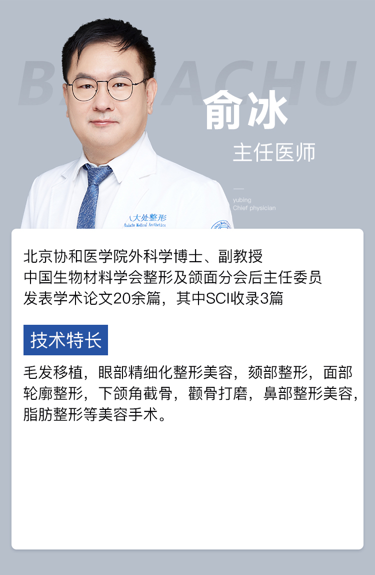 俞冰从事整形外科工作23余年,拥有丰富的临床经验,在颅颌面整形领域造诣深厚、技术精湛,尤其擅长眼部精细化整形美容,颏部整形,面部轮廓整形,下颌角截骨,颧骨打磨,鼻部整形美容,脂肪整形等美容手术。发表有《颅内外联合入路治疗额眶骨折》、《延长成骨术修复颅骨缺损的实验研究》等专业学术论文,在业内具有深远的学术影响力。其精湛的手术技巧,也得到了就医者的广泛认可。