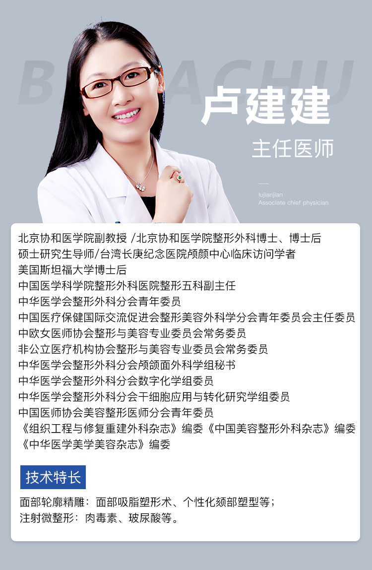 卢建建从事整形外科工作多年,拥有丰富的临床手术经验,擅长面部轮廓精雕与注射微整形,包含面部吸脂塑形术、个性化颏部塑型等。其手术技术细腻、精湛,手术设计眼光独到,注重将先进的治疗理念应用于临床手术。多次受邀参加国际学术会议,并做精彩演讲。现担任《组织工程与修复重建外科杂志》、《中国美容整形外科杂志》等专业杂志编委。在手术中引入现代时尚美容理念,获得了就医者的广泛好评。